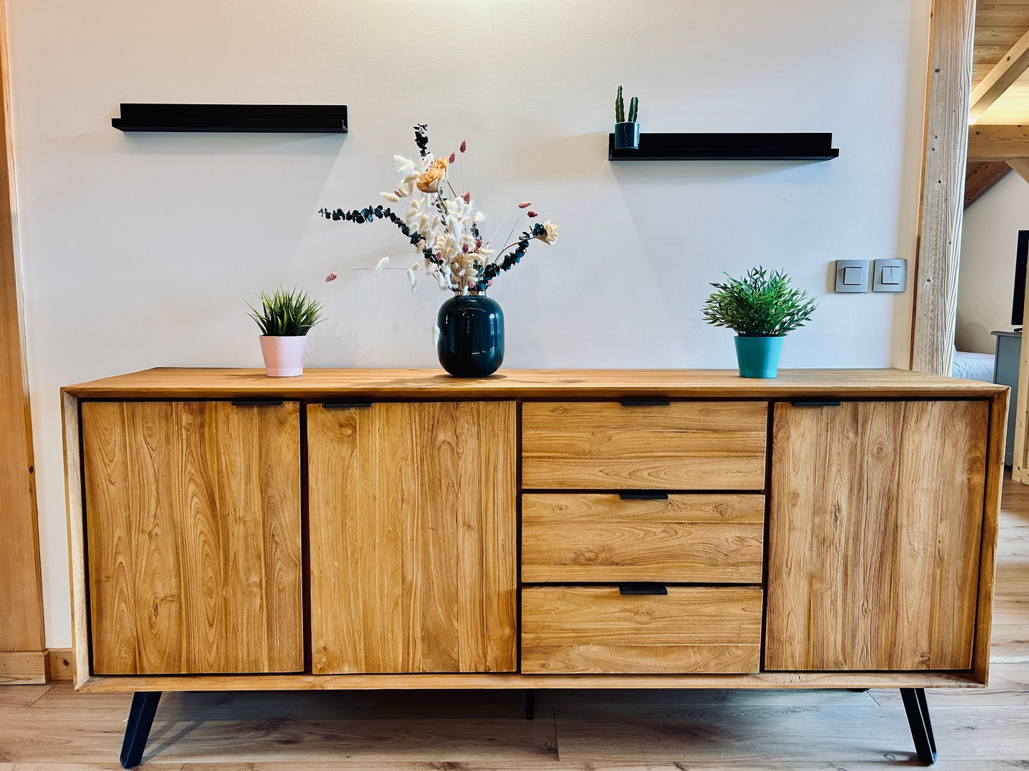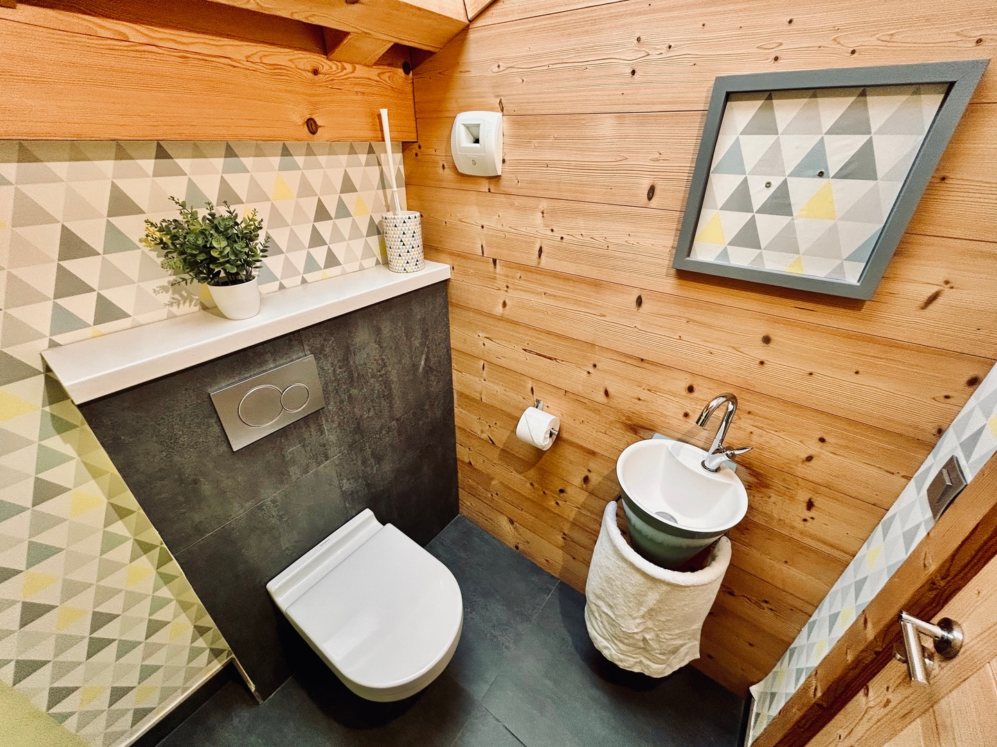 When you enter the chalet, you will find a large living room with a beautiful open-plan kitchen. You will also find on the ground floor a shared toilets, a double bedroom (queen size bed) with its en-suite bathroom, a laundry and a garage.